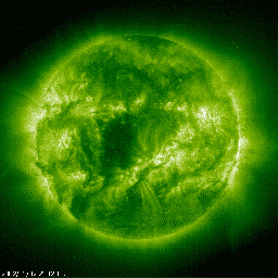 EIT 195 Å image showing a coronal hole approaching the central meridian. Three to four days later solar wind speed increased to around 600 km/s and the geomagnetic field was at active to minor storm levels
