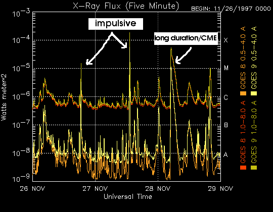 Examples of impulsive flares (usually not associated with a large CME) and a long duration flare. The long duration flares with this type X-ray signature are often accompanied by CMEs capable of producing geomagnetic storms.