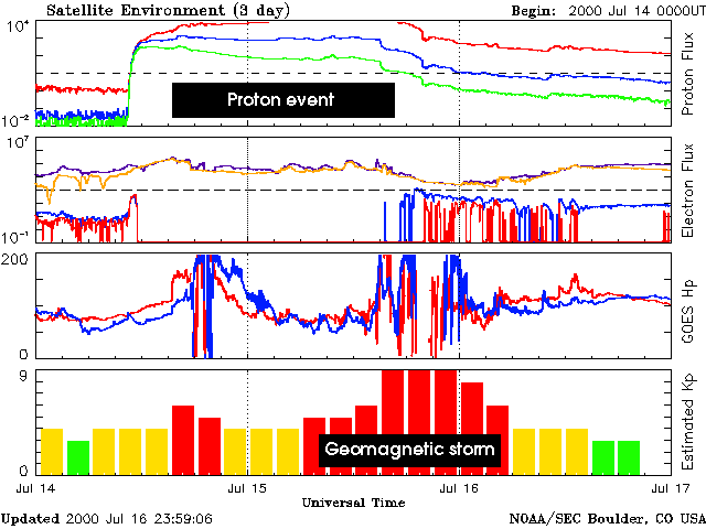 GOES satellite environment plot during storm time. Notice the proton event (top panel). ACE sensors were adversely affected by this event. A severe geomagnetic storm peaked late on July 15.